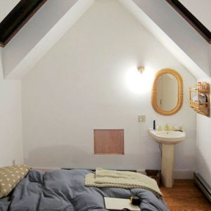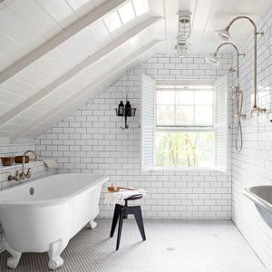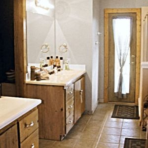 The master bath’s square footage was increased by demolishing the second- story crawl space. The room was remodeled by fitting a claw foot tub and a dual shower. The window openings were widened giving the room more light. The floor was tilted slightly for better drainage.