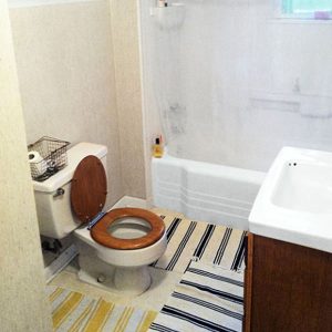 The orange walls and an abnormal layout made this bathroom ordinary and uninviting.