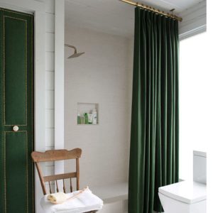 The tub was removed to enlarge the shower space. Ceiling set curtains were used to create an impression of towering ceiling.