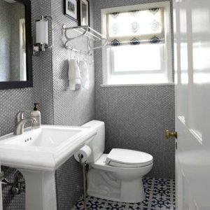 The makeover focused on concealing the plumbing work by maintaining the original bathroom layout. The room was given a complete transformation by Moroccan cement floor tiles, a classic Kohler pedestal sink and an efficient commode.