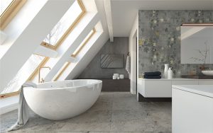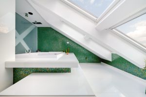 Here is another intelligent way to still get skylights if you lack openings at the top. The sloping side also adds to the modern approach in design of the bathroom with the white and grey and lots of natural light so close to the bath tub. It is a truly spacious feel.