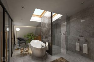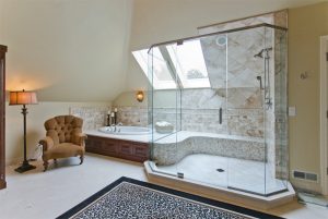 In this design, the bath tub and shower area each get a single window skylight thanks to a separating wall. It allows for maximum light to get to the two areas while matching the overall design of the bathroom.